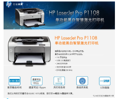 參數(shù) [商品名稱] 惠普(HP)P1108 [最大支持幅面] A4 [打印速度] 18頁/分 [品牌] 惠普(HP) [型號(hào)] P1108